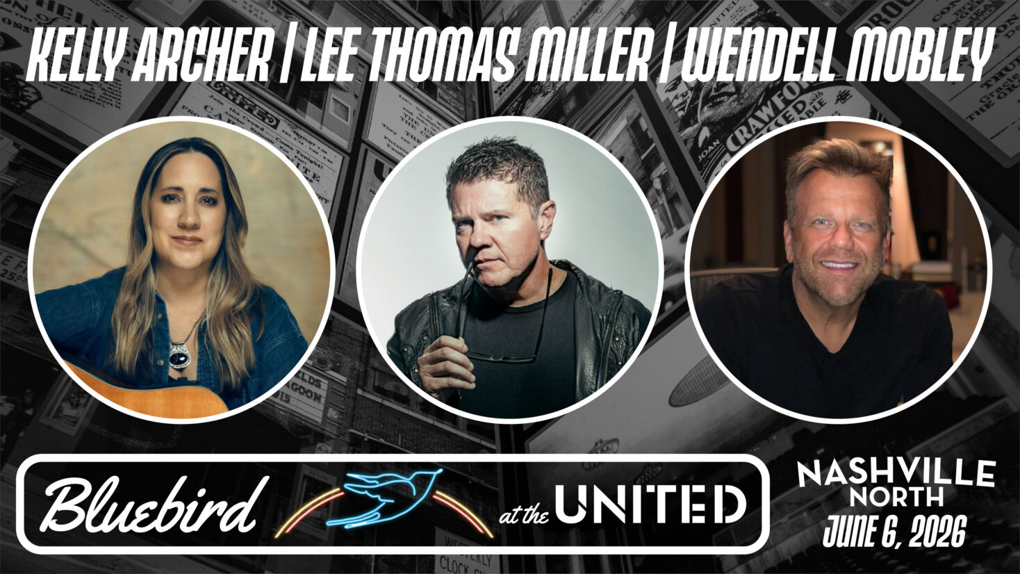 Our June show in the BLUEBIRD @ the UNITED concert series in partnership with the renowned Bluebird Cafe features Kelly Archer, Lee Thomas Miller & Wendell Mobley – three legendary songwriters and performers of Nashville taking center stage to share their music and the compelling stories that inspired their songwriting journey.
